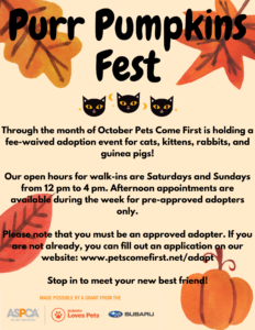 Starting Oct. 1st through Oct. 31st, cat and small critter adoption fees are waived thanks to a generous grant from Subaru Loves Pets! A few things to note about our event: