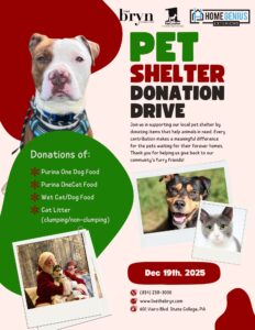 The Bryn in State College is currently running a donation drive for Pets Come First! Any of the donations listed below would be so helpful for our animals this holiday season. Thank you!