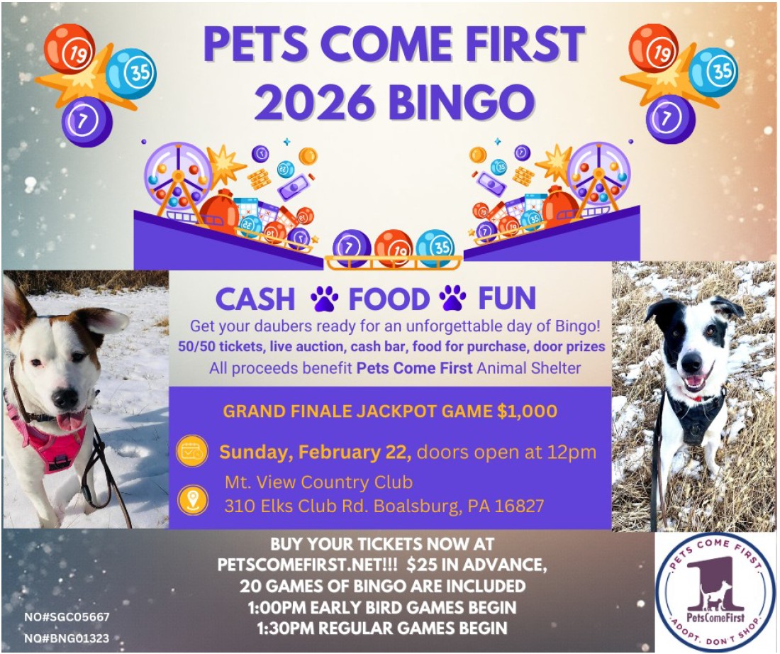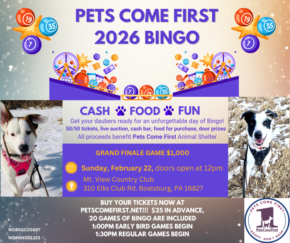 Hello PCF Bingo Fans! Those who paid and registered to attend yesterday's bingo event (which was cancelled due to the storm), you are automatically registered to attend our rescheduled bingo event which will be held on Sunday, March 15th. Please be in touch with Holley at holleycyone.petscomefirst@gmail.com if you have any questions. Thank you